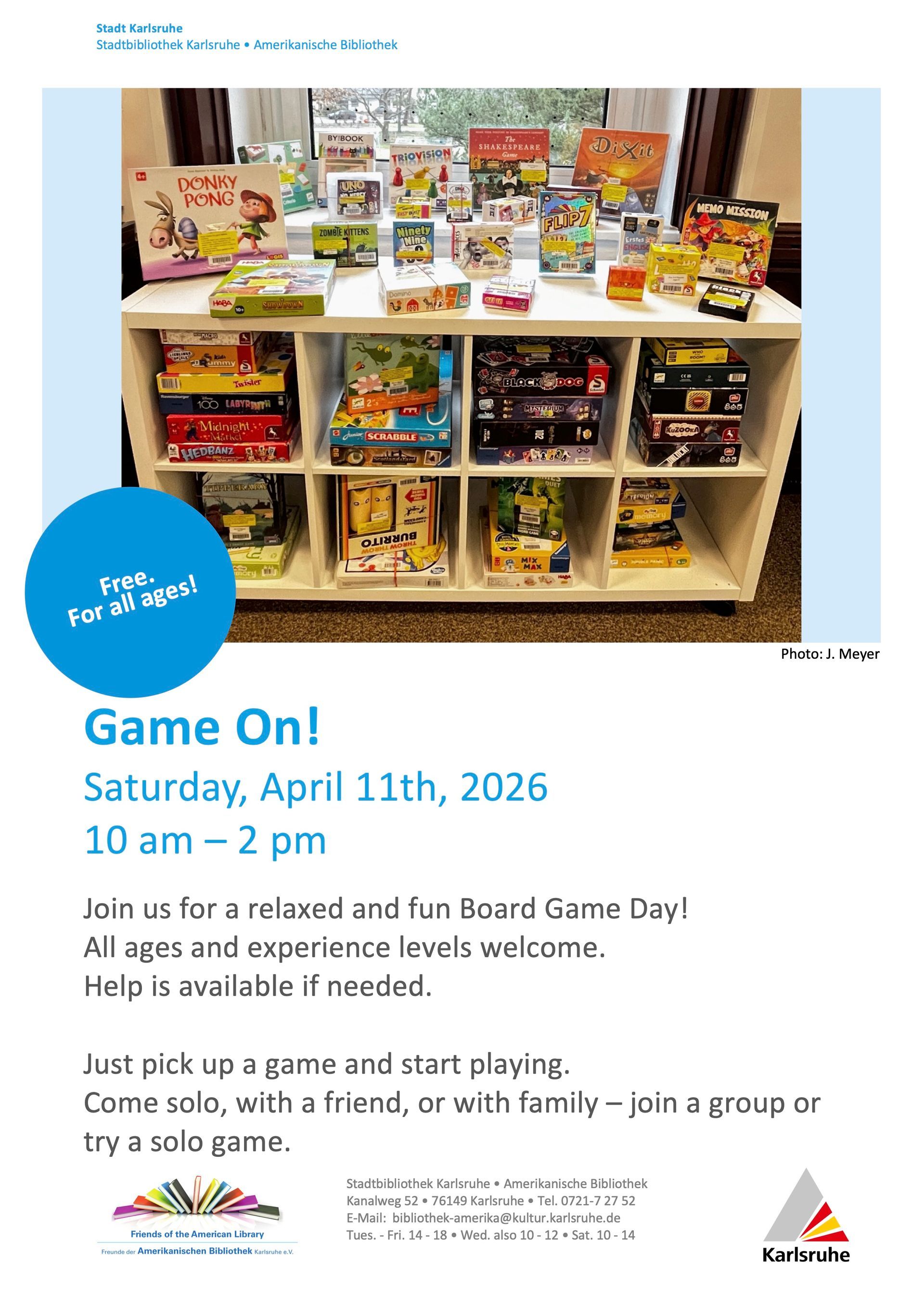 The American Library has more than 30,000 books. We also have audio books for all ages, music CDs, DVDs and BluRays, magazines and a newspaper, Nintendo, Wii and other games. New: Board games in English! Stop by and check some out!